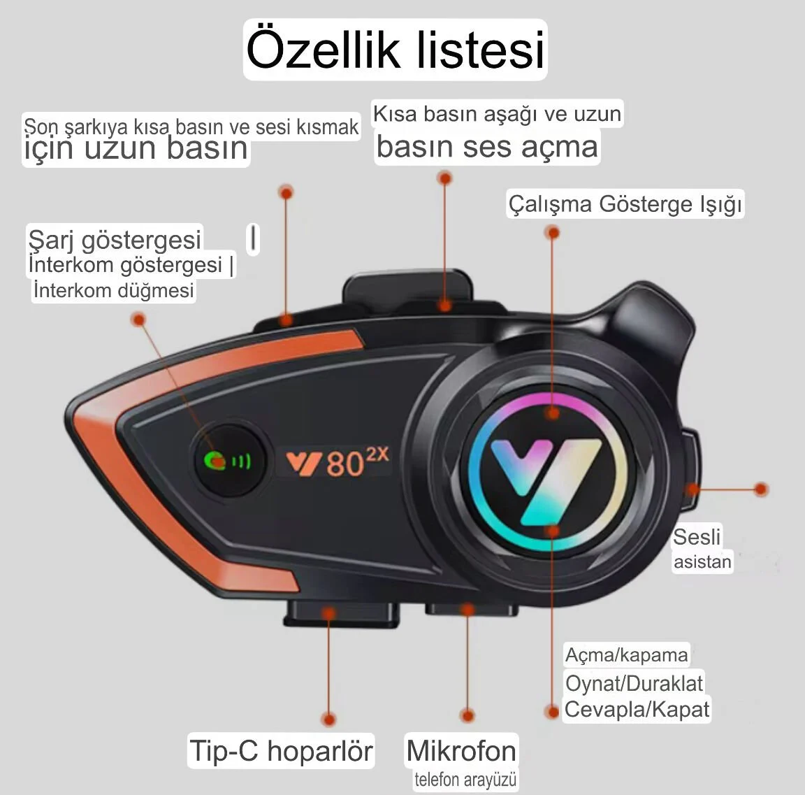RideTalk Y80 Işıklı Motosiklet Kask İletişim Cihazı Interkom